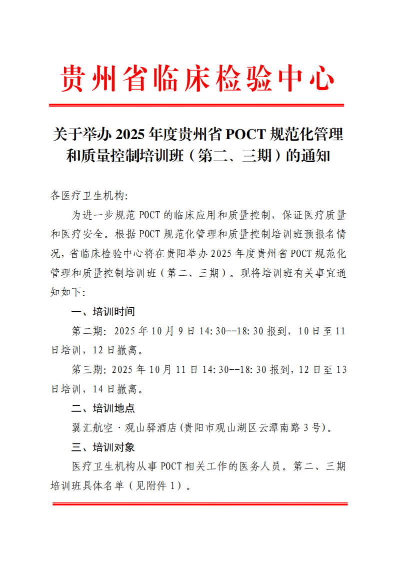 关于举办2025年度贵州省POCT规范化管理和质量控制培训班(第二、三期)的通知