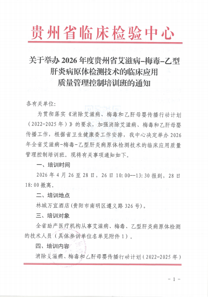 关于举办2026年贵州省艾滋病-梅毒-乙型肝炎病原体检测技术的临床应用质量管理控制培训班的通知